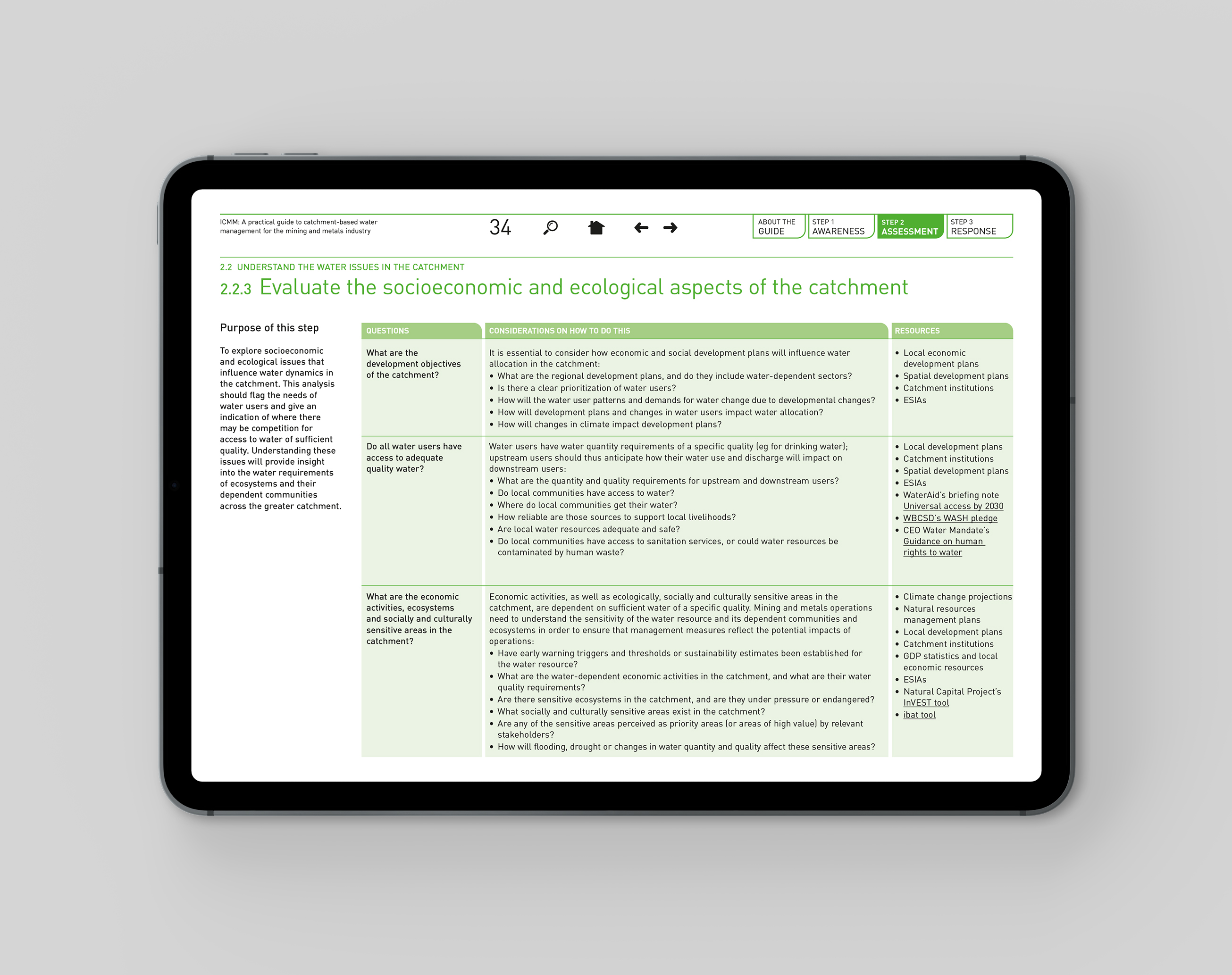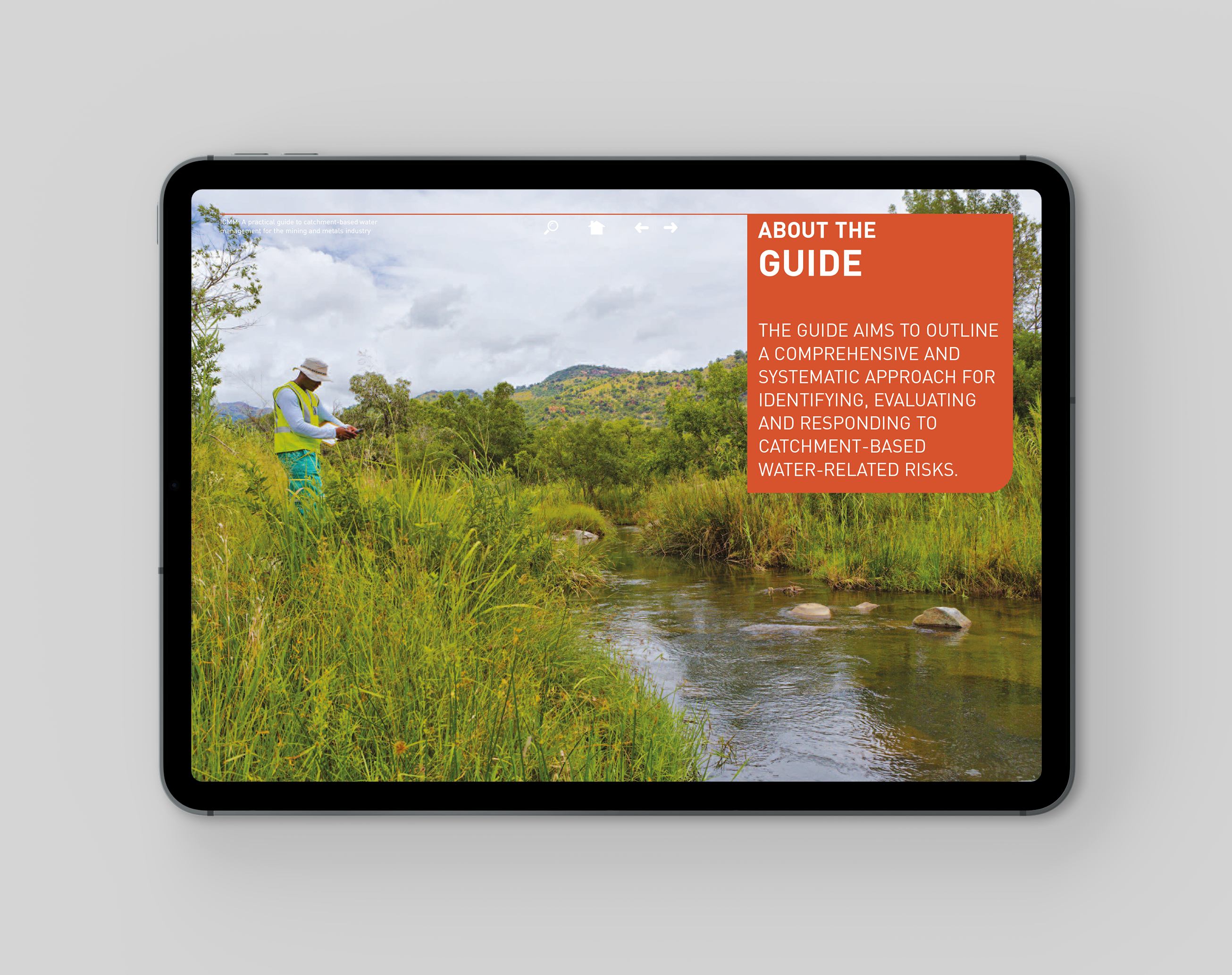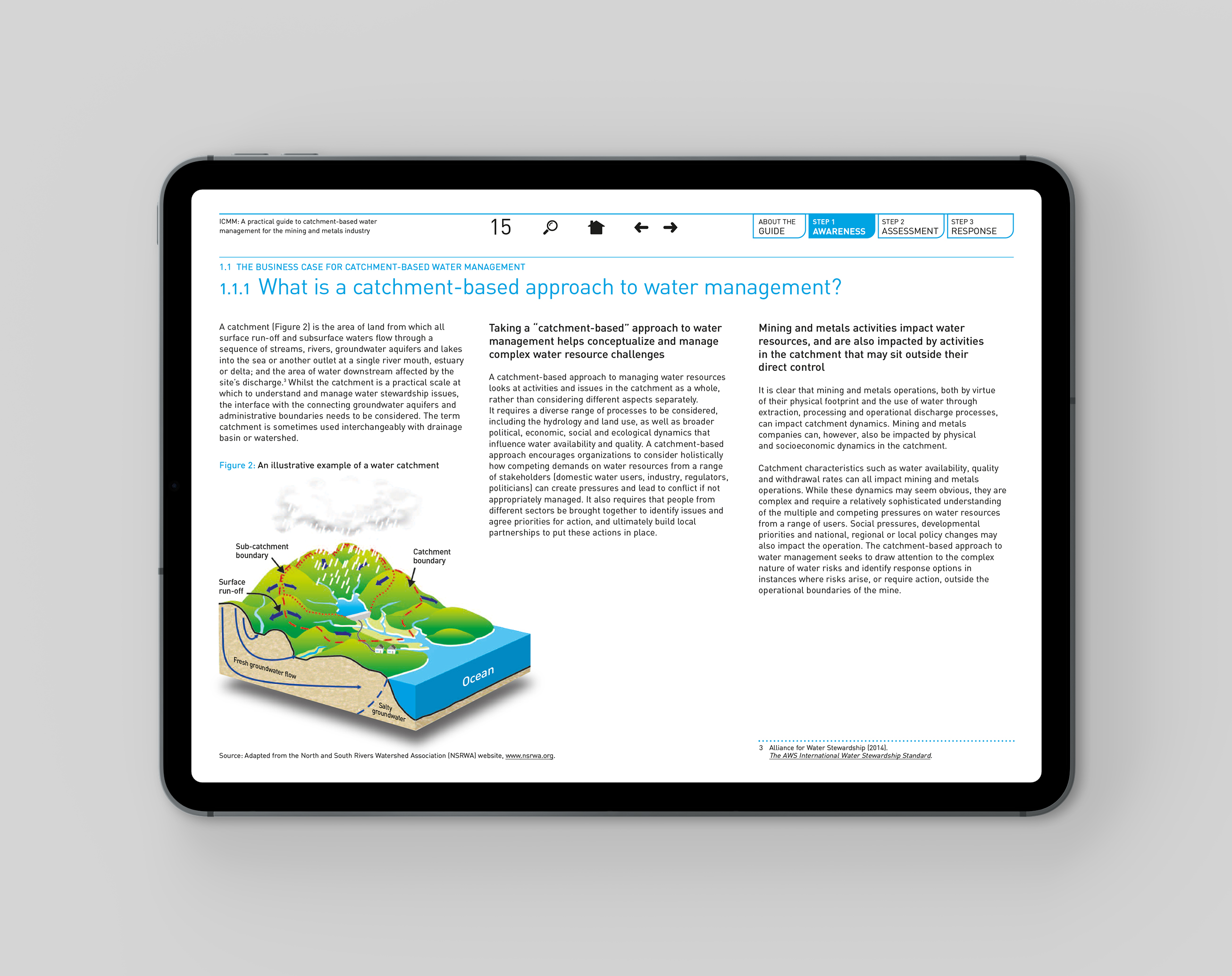 This interactive digital guide helps companies in the development of their water strategies and plans in accordance with the local context and hydrology in which mining and metals operations take place. Available as an online resource in English, French, Portuguese, and Spanish.