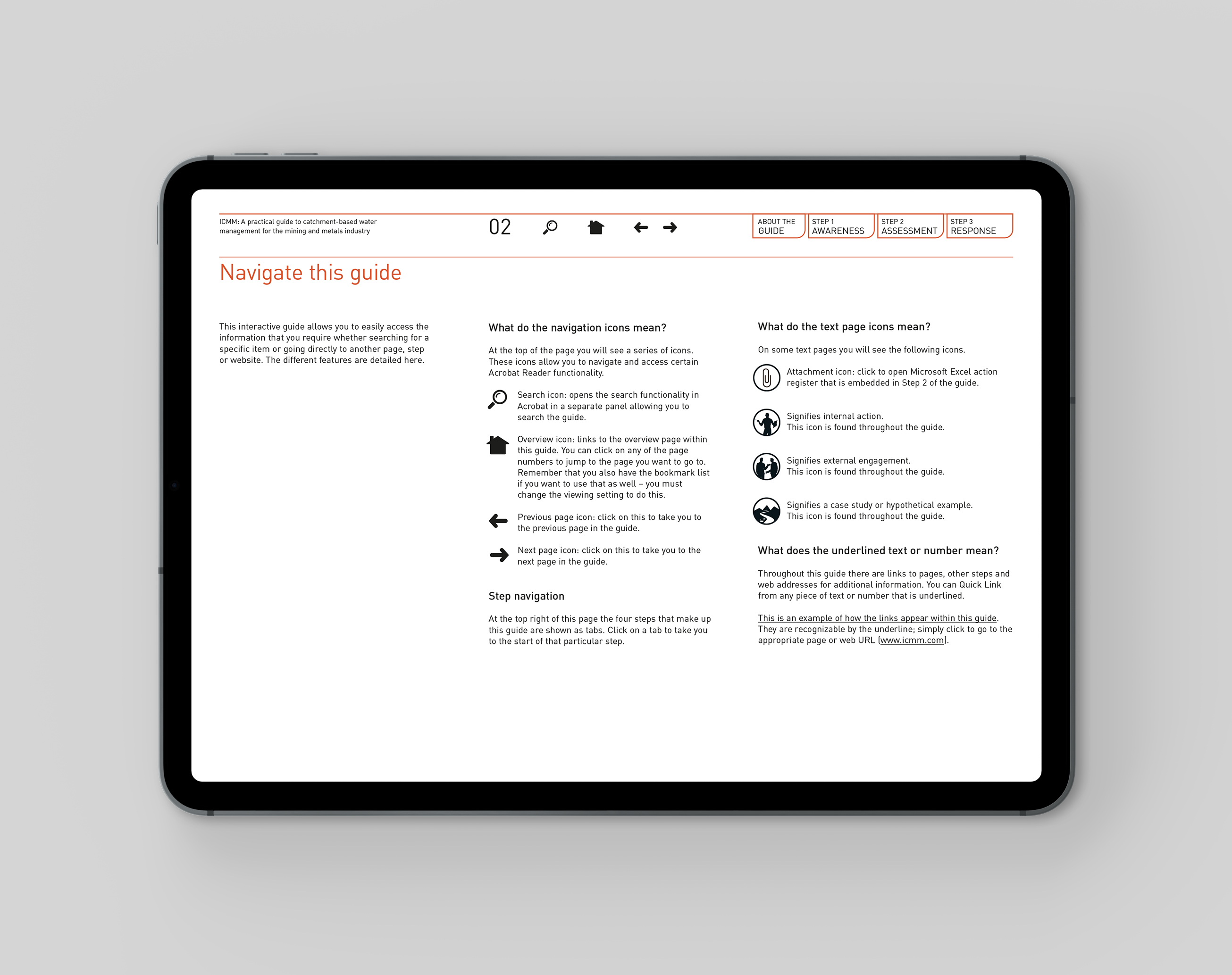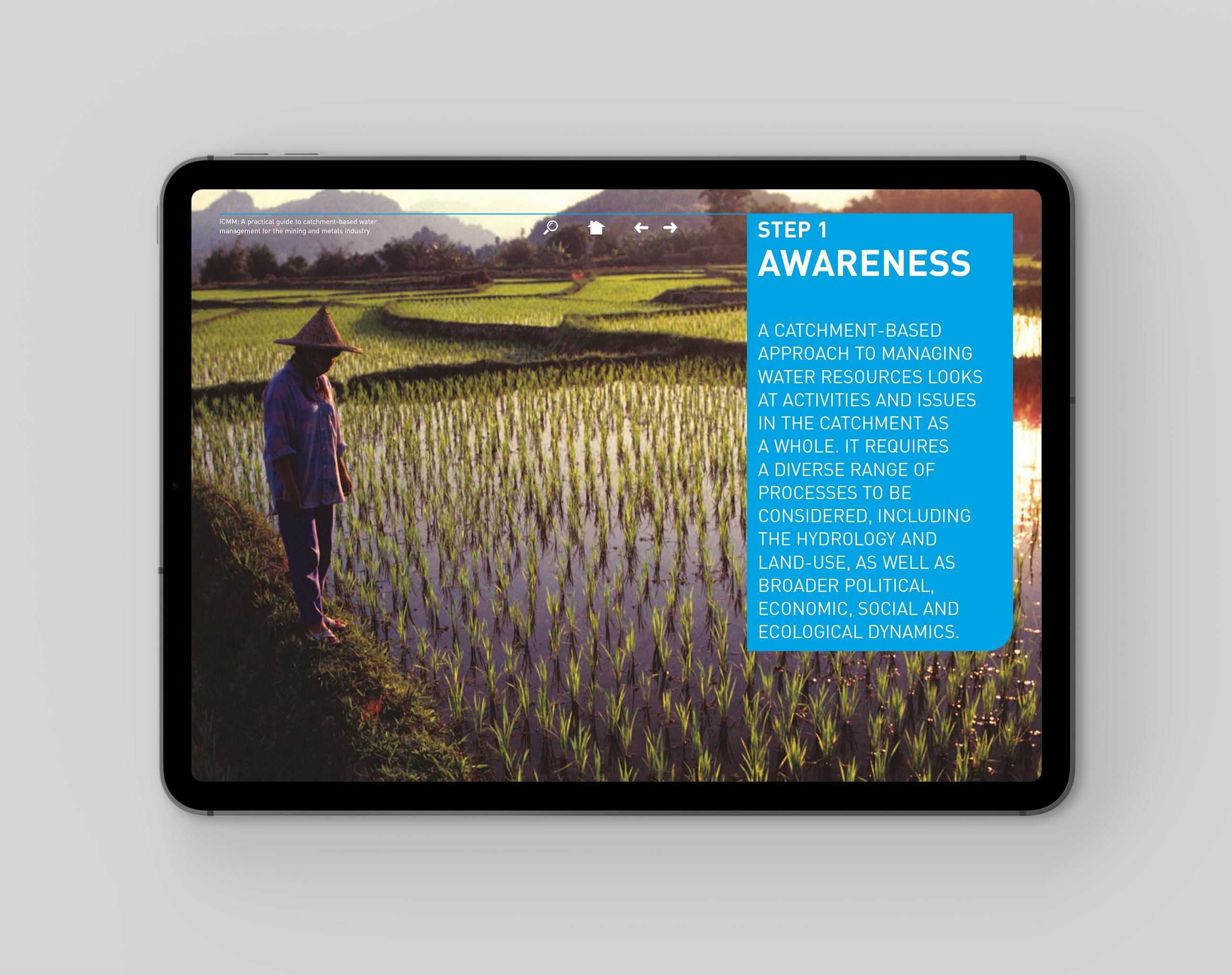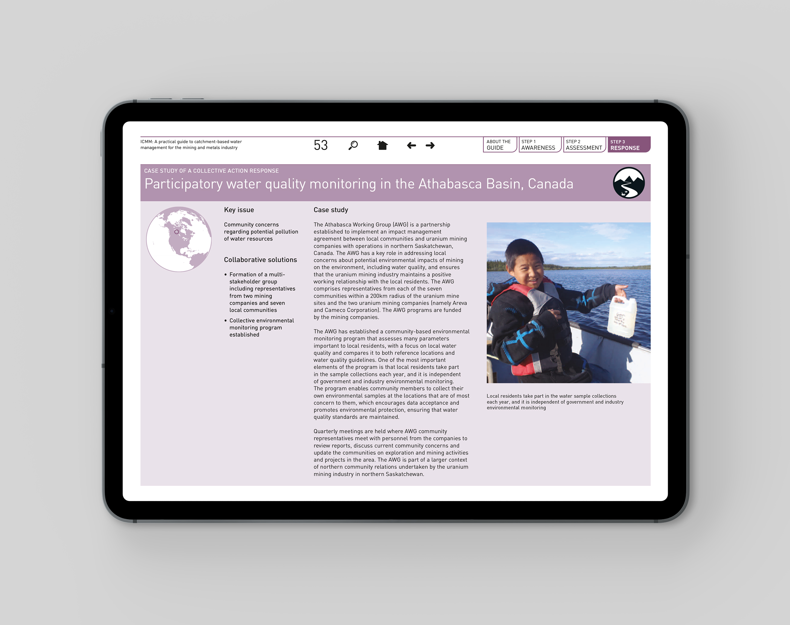 This interactive digital guide helps companies in the development of their water strategies and plans in accordance with the local context and hydrology in which mining and metals operations take place. Available as an online resource in English, French, Portuguese, and Spanish.
