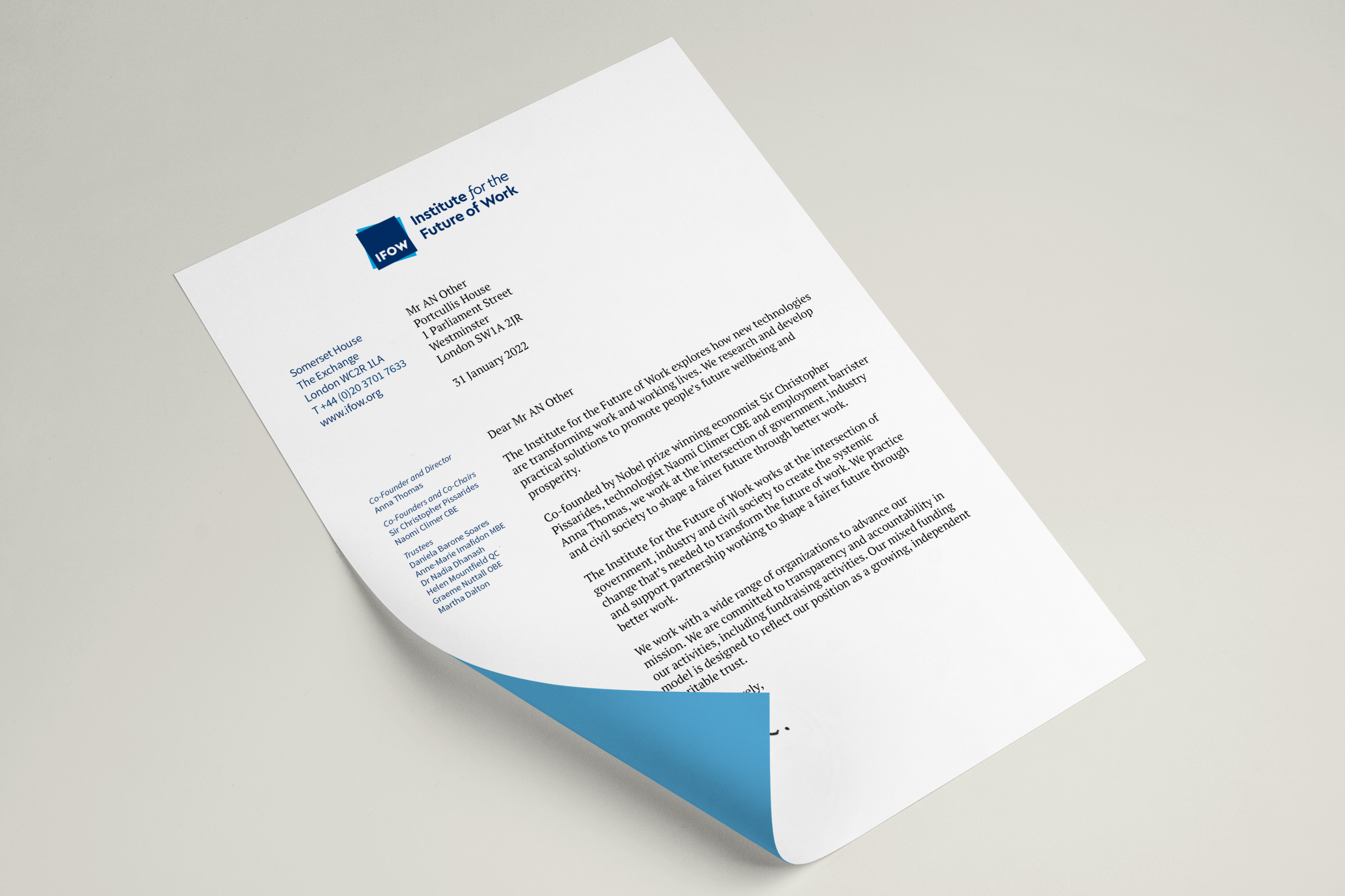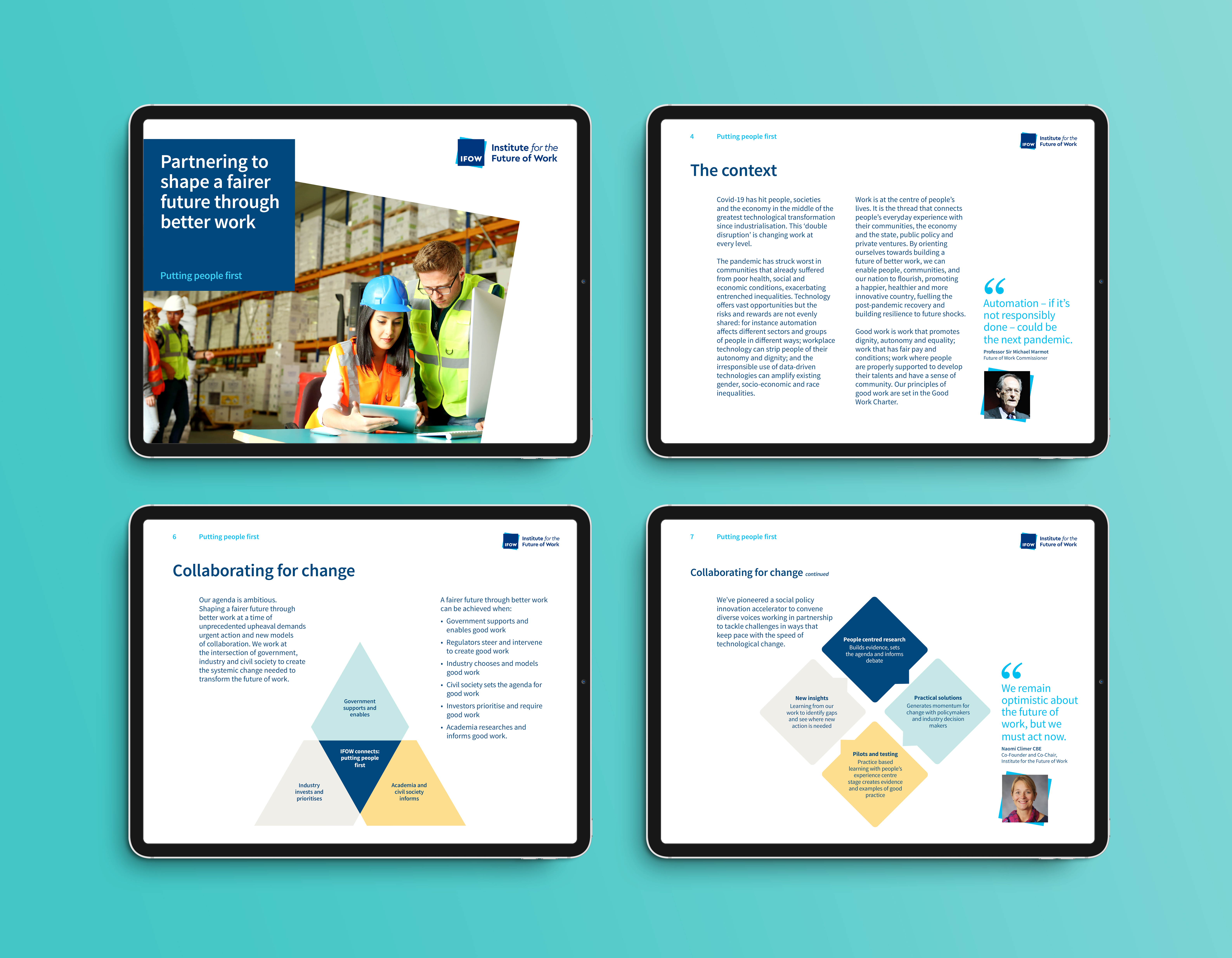 To influence decision and policy makers across government, employers, and trade unions their research and its conclusions need to be presented in a clear and recognisable manner. The design of the IFOW’s materials, which include Canva and InDesign templates, have been developed over time with the core team at the organisation.
