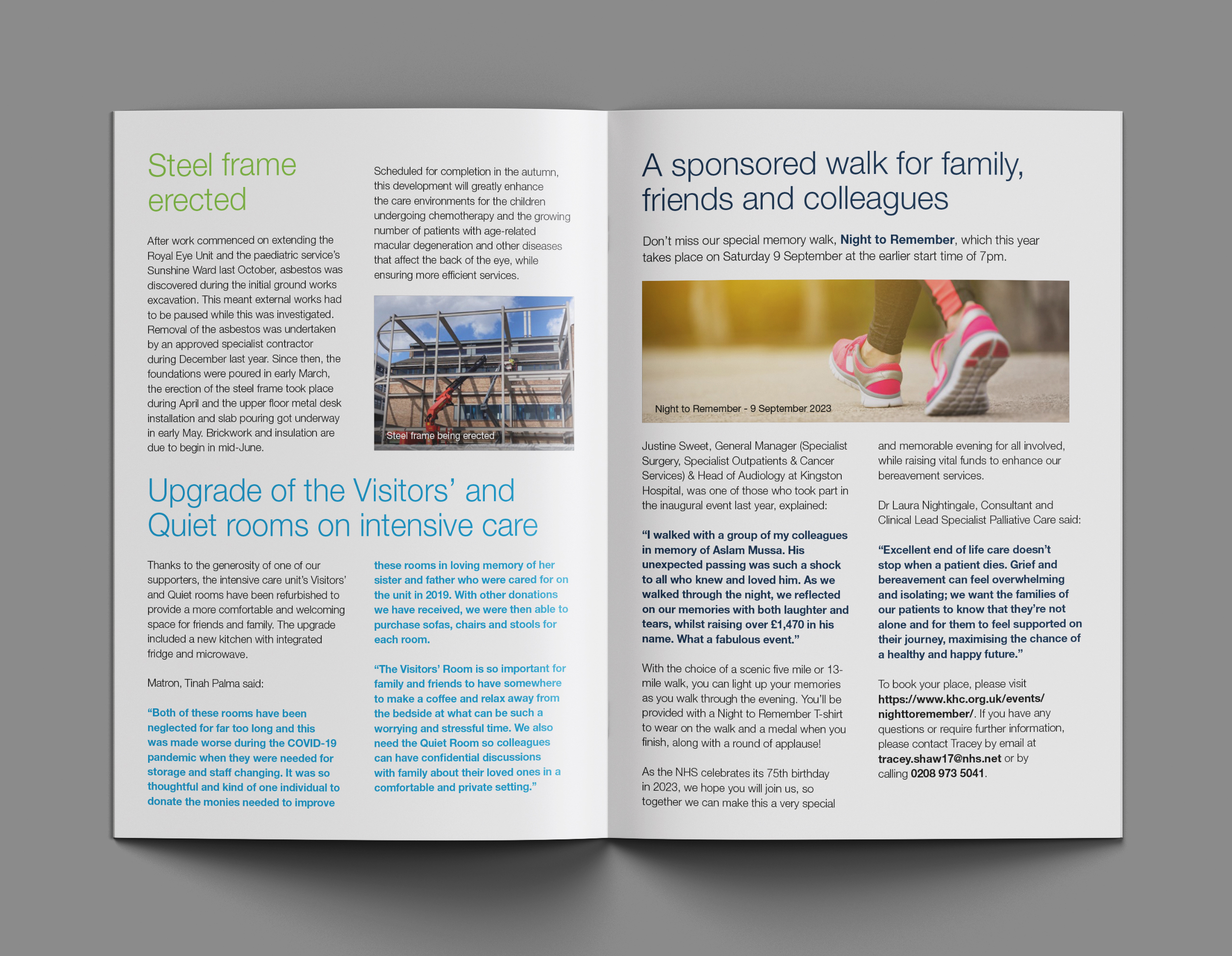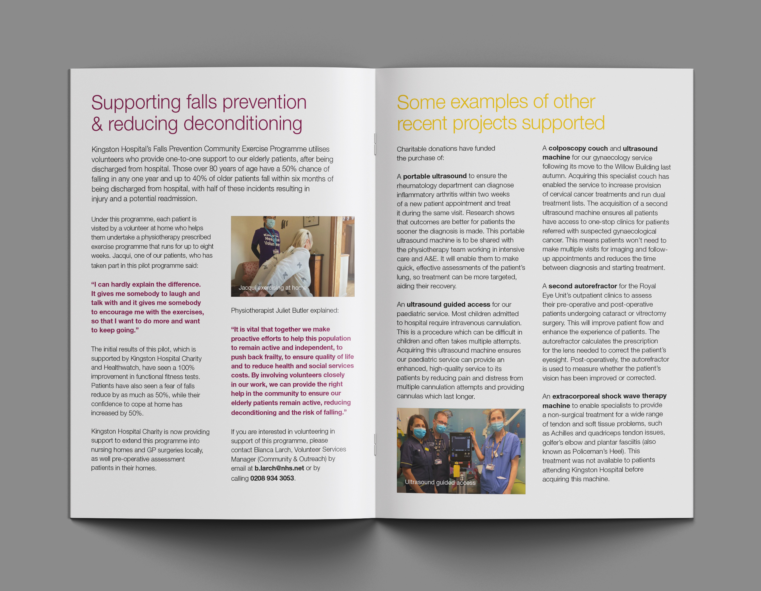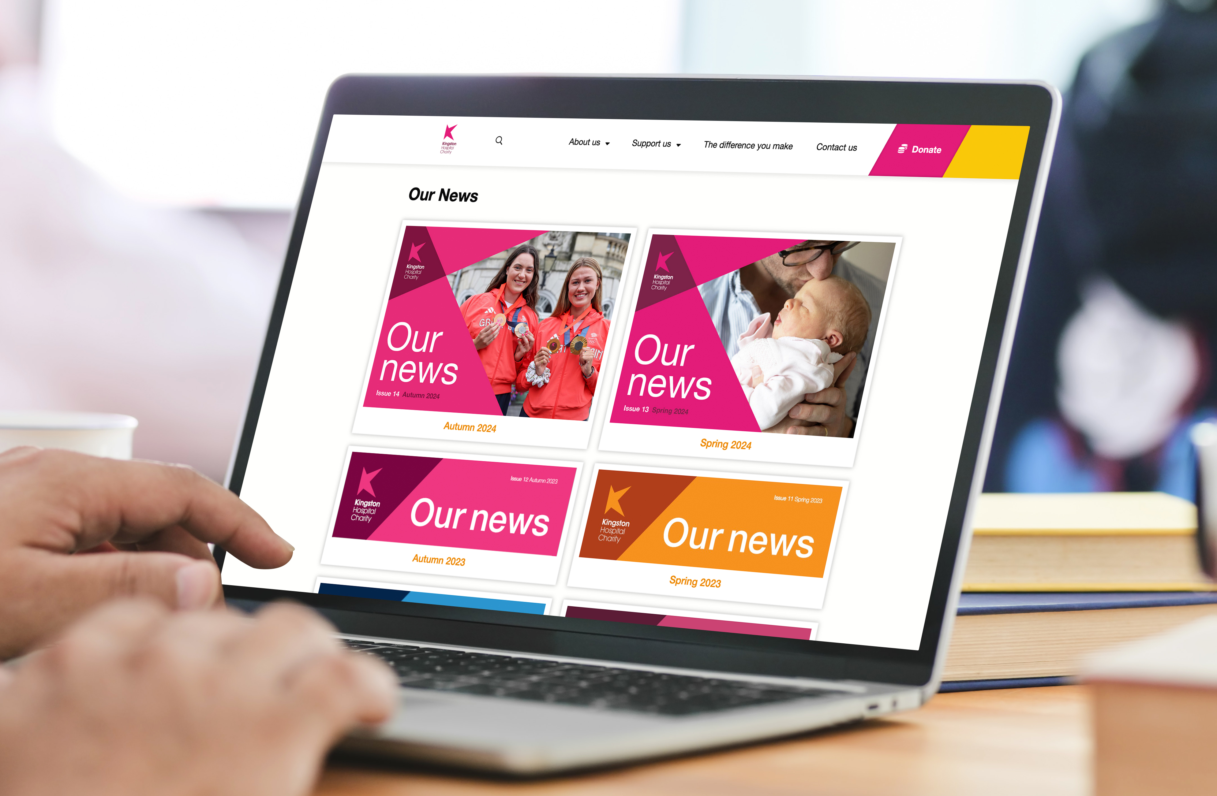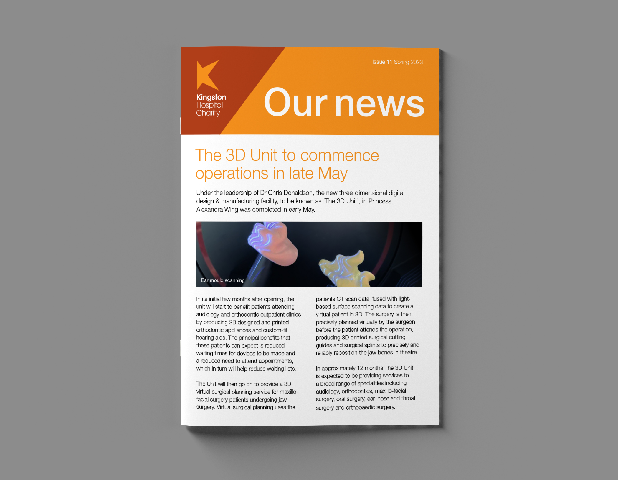 Kingston Hospital Charity relies entirely on the funds raised through patients and their loved ones, philanthropists, charitable trusts, businesses and community groups to help provide a quality of care that is over and above what is possible with NHS funding alone. In seeking to increase awareness and recognition among their stakeholders they asked John Spencer (Offthetopofmyhead) to create a new logo and visual identity to bring coherence to their communications.