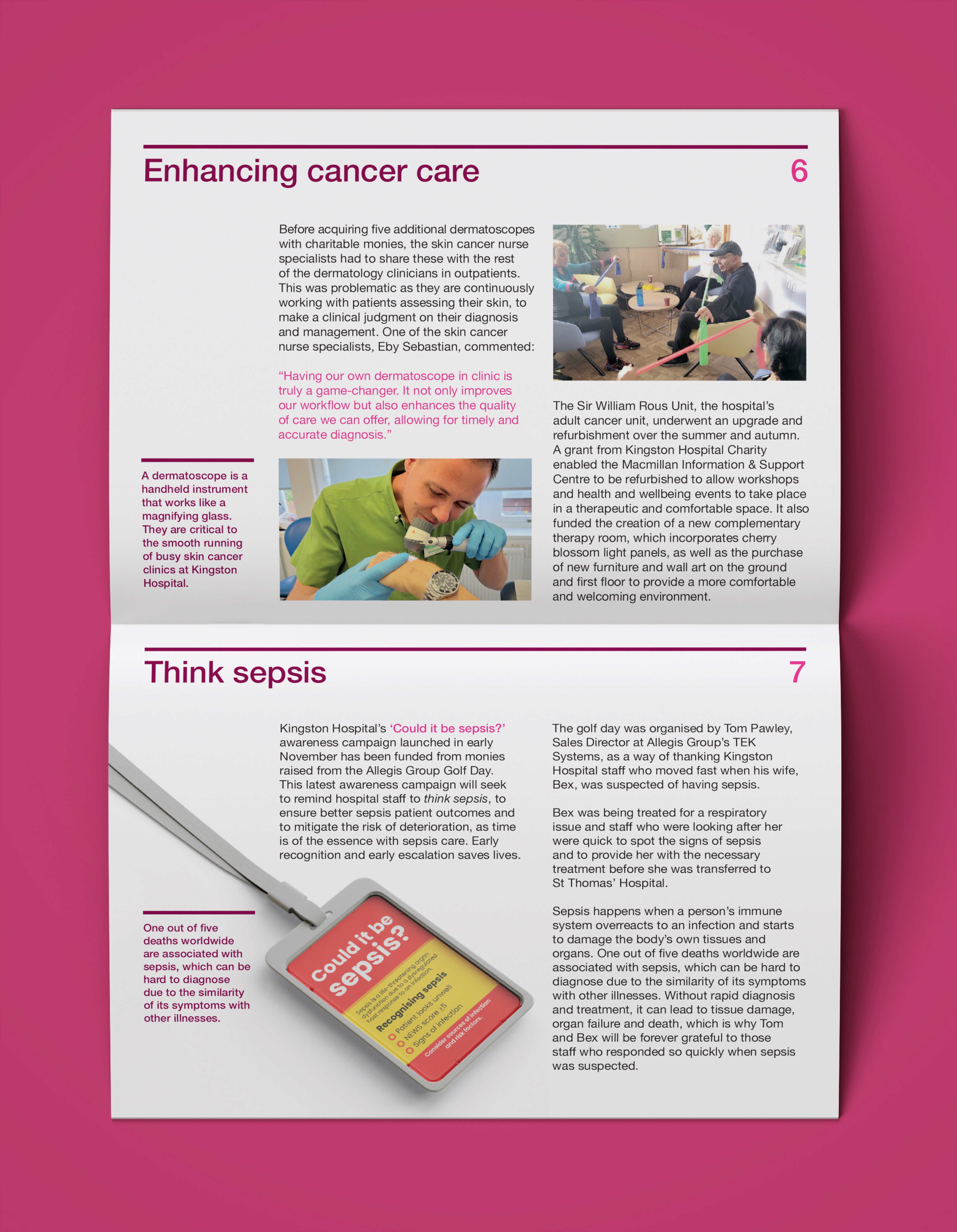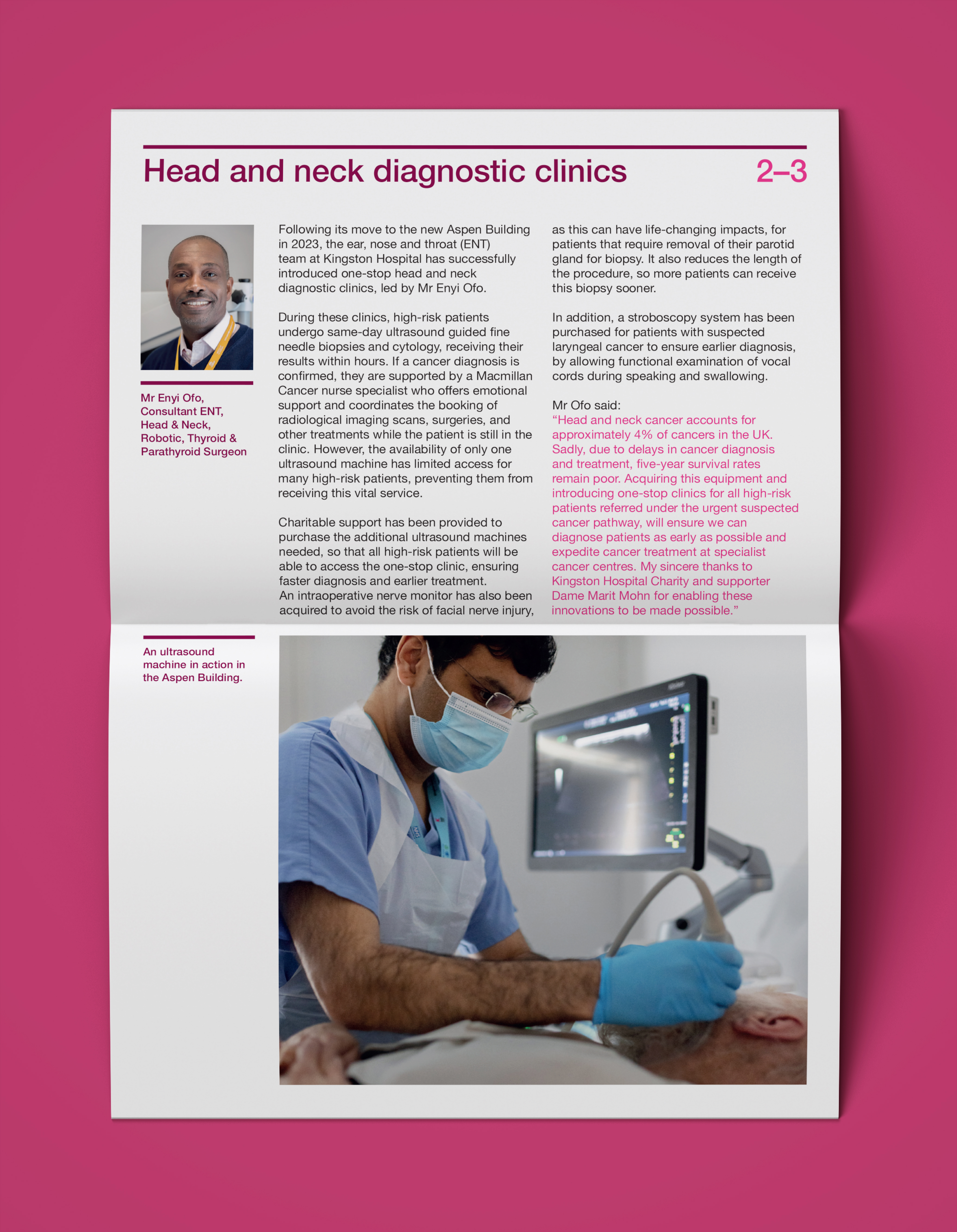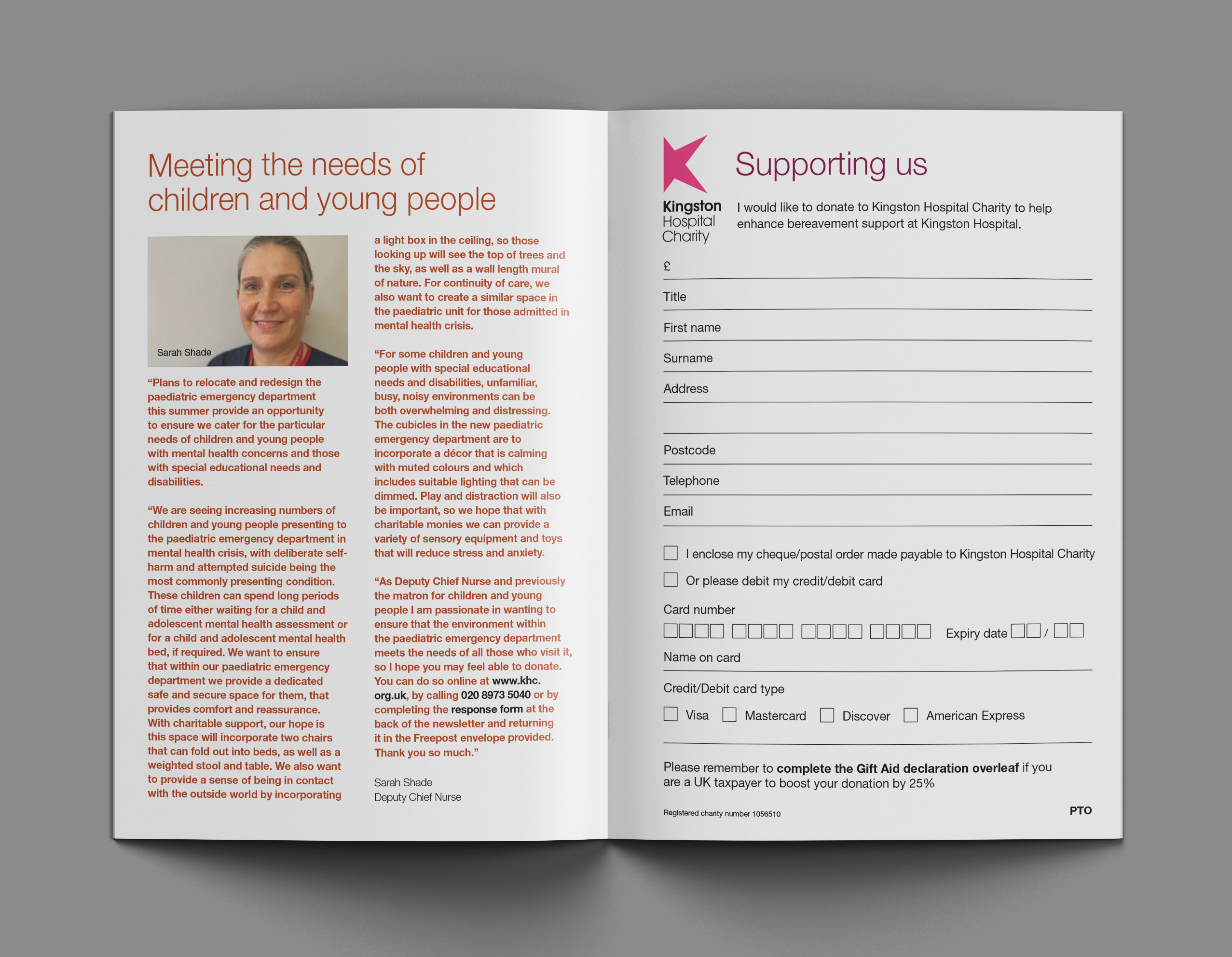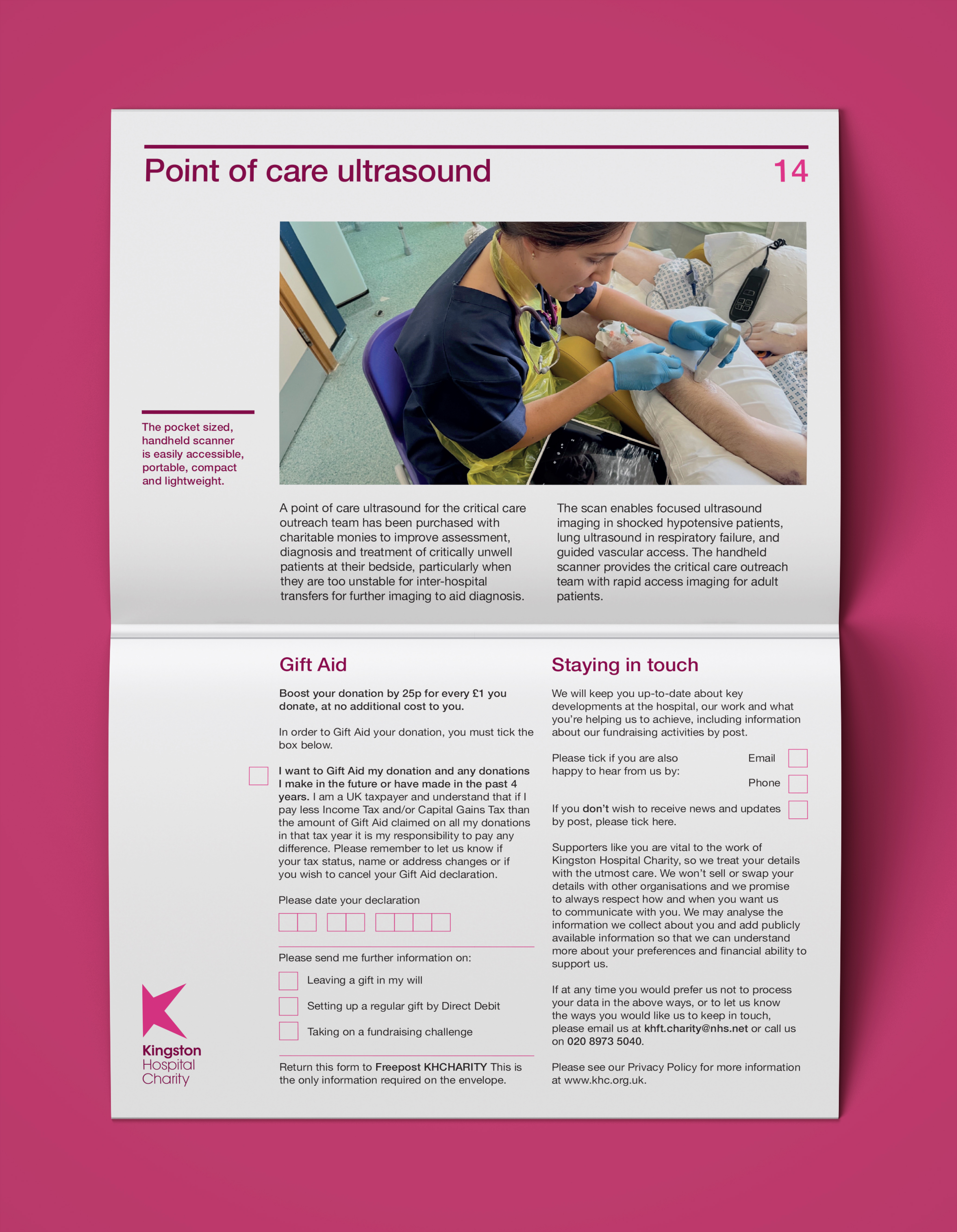 Kingston Hospital Charity relies entirely on the funds raised through patients and their loved ones, philanthropists, charitable trusts, businesses and community groups to help provide a quality of care that is over and above what is possible with NHS funding alone. In seeking to increase awareness and recognition among their stakeholders they asked John Spencer (Offthetopofmyhead) to create a new logo and visual identity to bring coherence to their communications.