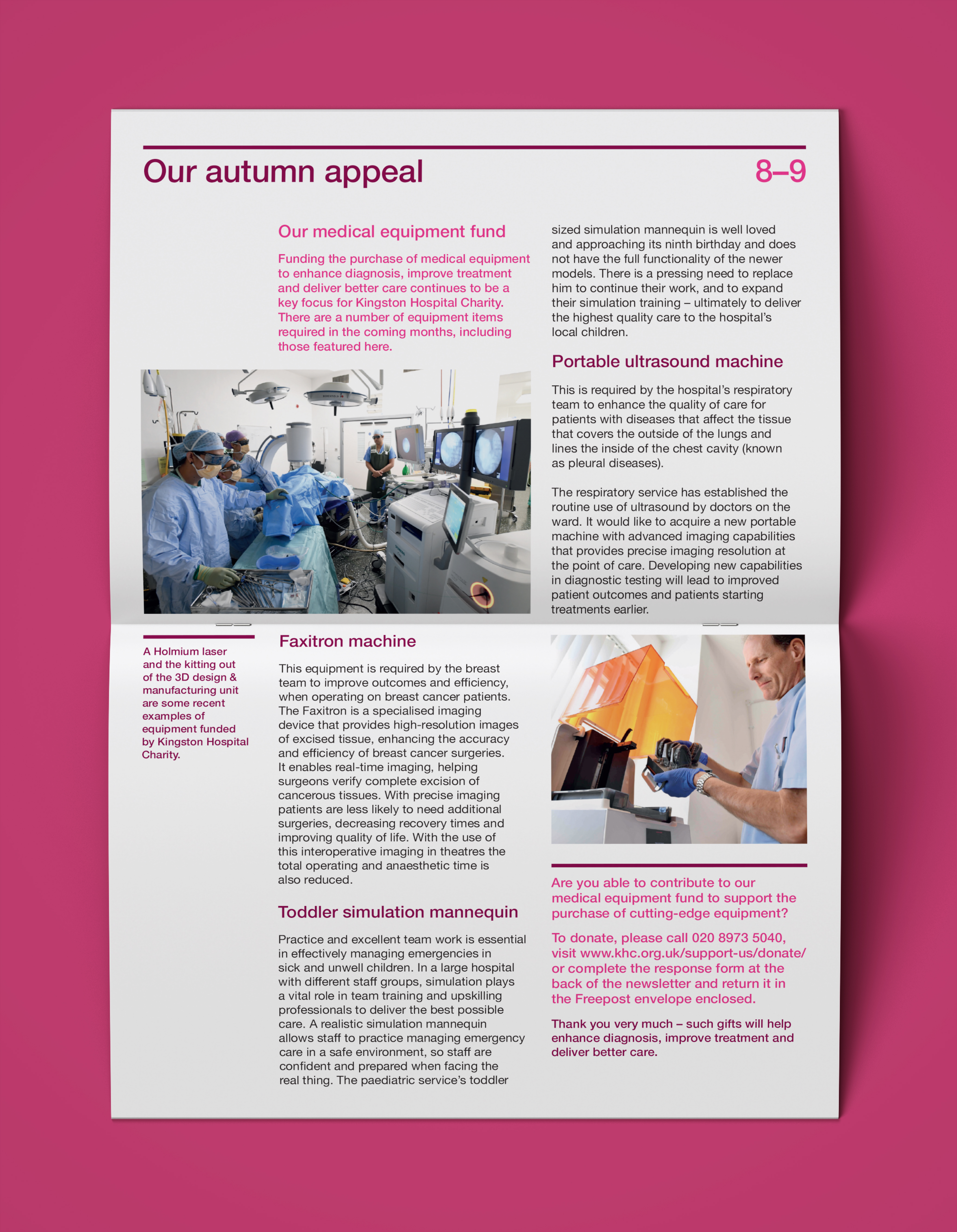 As part of this process Our news, the bi-annual print and digital publication that encourages fundraising and highlights the benefits of this to the hospital and community, was redesigned. The intended audience, visual hierarchy, typography, layout, colour, and navigation of the publication (A5 page format) were considered along with feedback from the organisation’s media team. Selected pages of the original and redesigned versions of Our news follow.